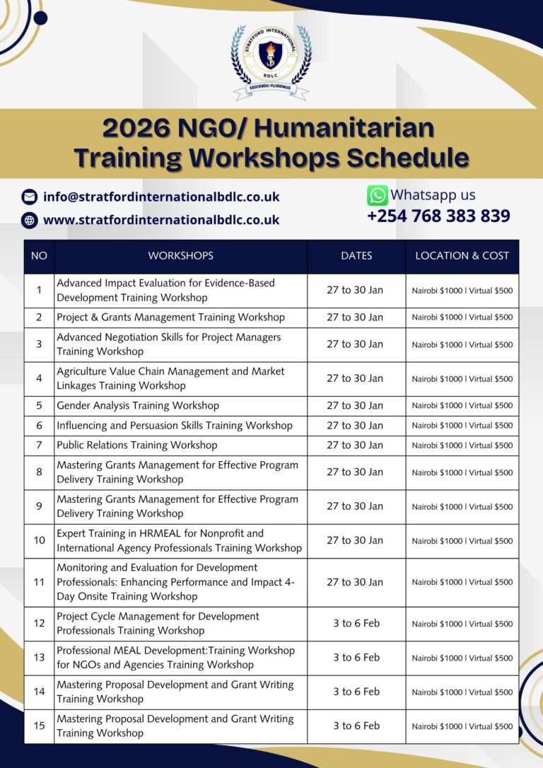 These courses focus on areas such as project management, leadership, fundraising, monitoring and evaluation, grants management, and emergency response, Water Sanitation and Hygiene, Financial Management, Human Resource Management, Proposal Writing and Fundraising, Procurement and Supply Chain Management, Data analysis, Gender based violence, Sustainable development among others.